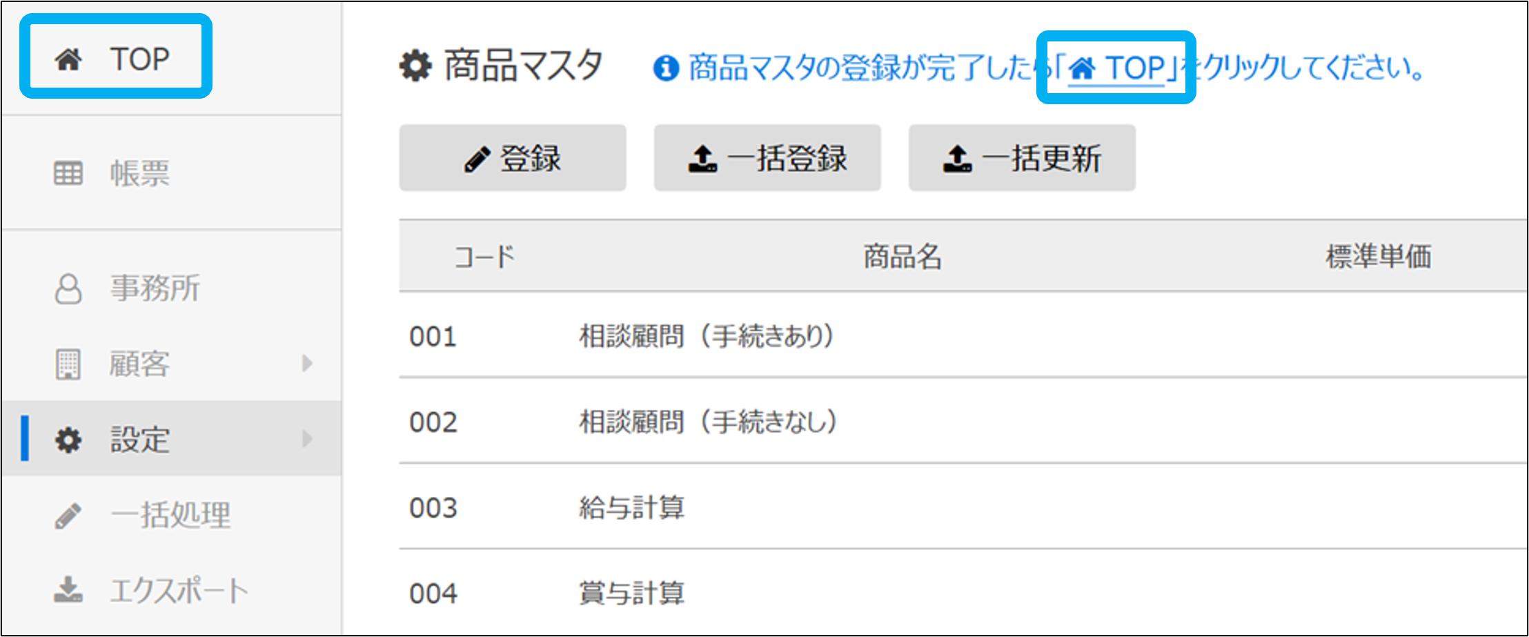 ①設定内の「商品マスタ」をクリック
