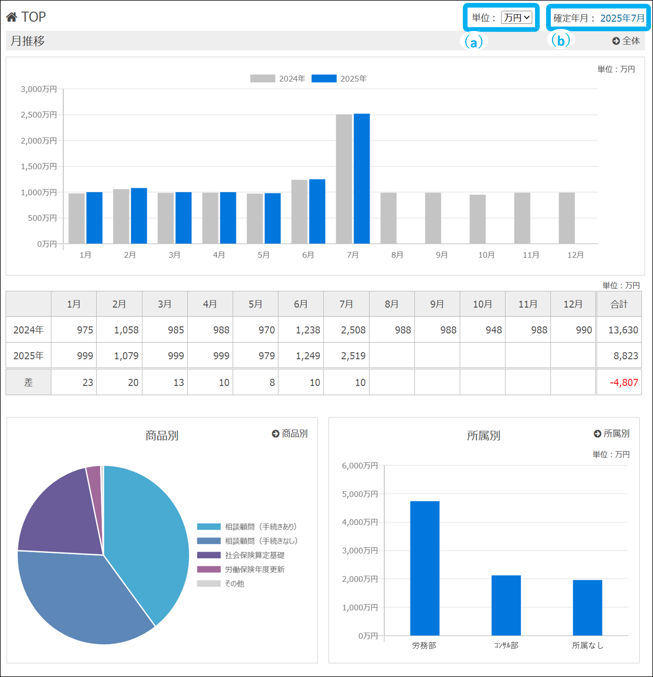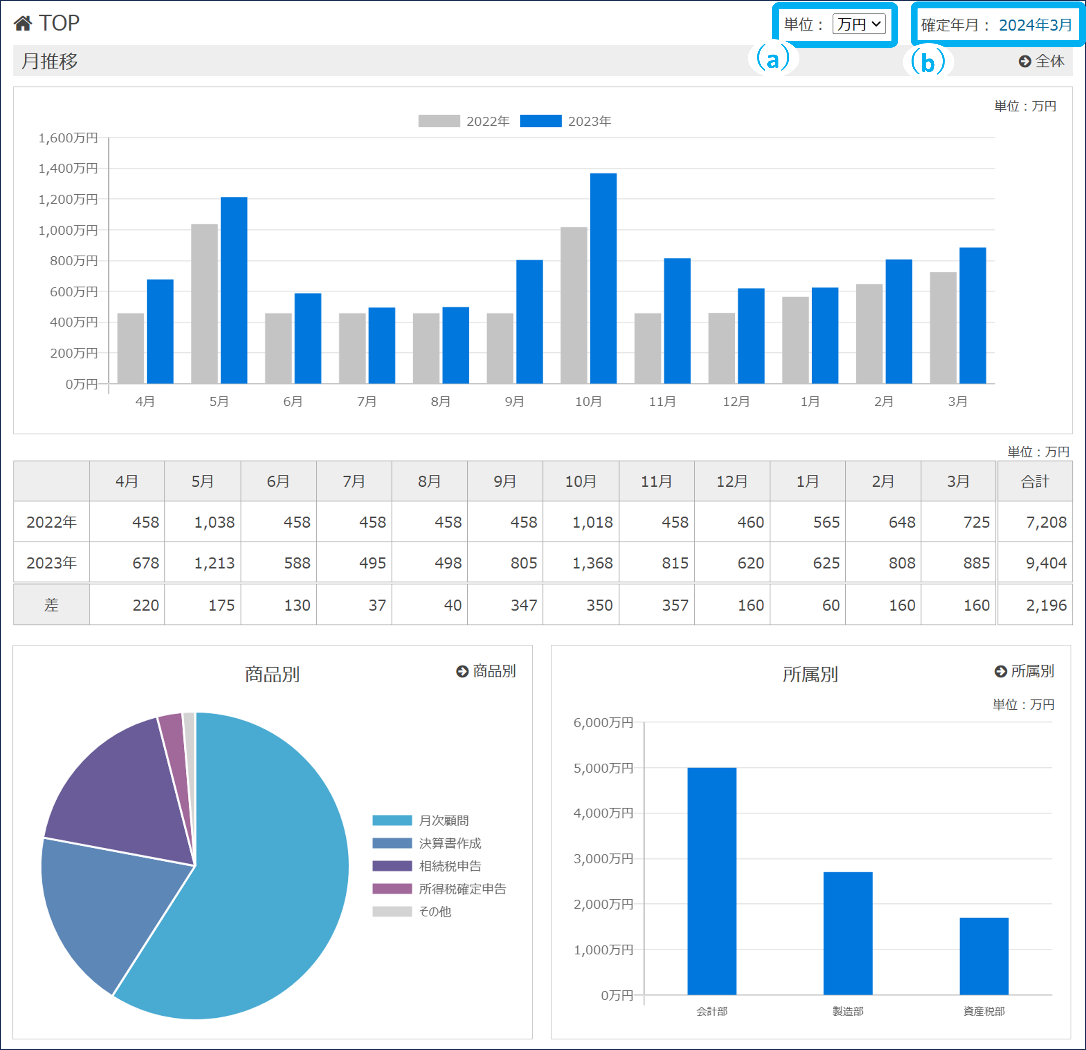 事務所全体の報酬を、2か年分の月推移や商品別、所属別にグラフと帳票で確認できます。