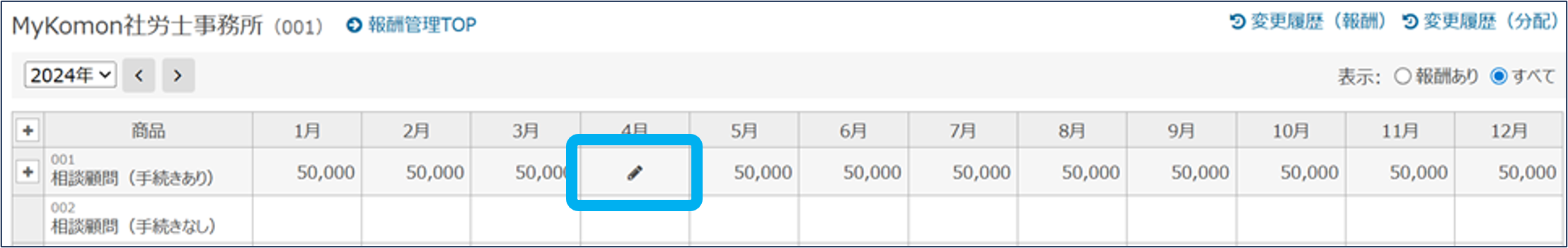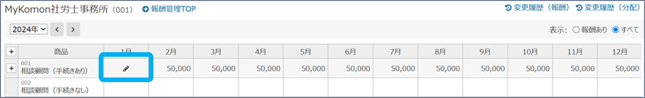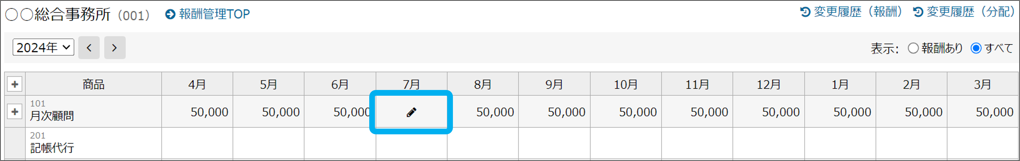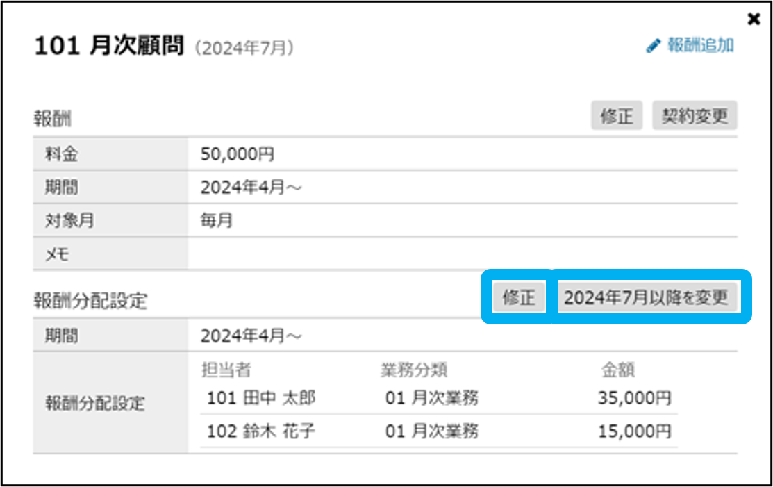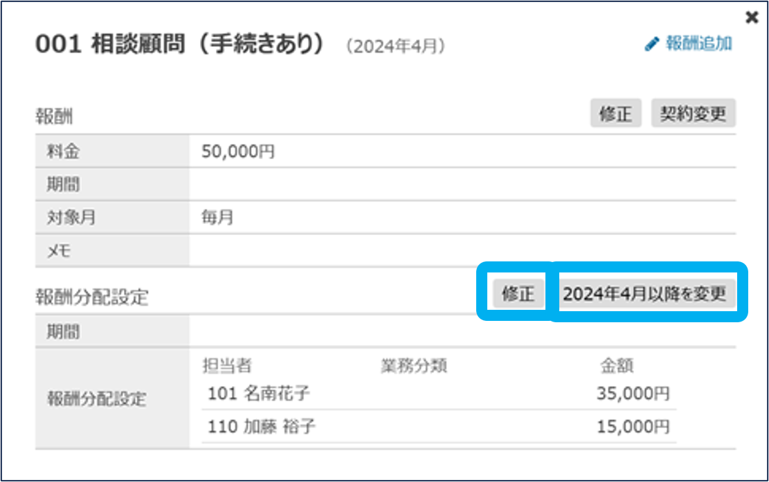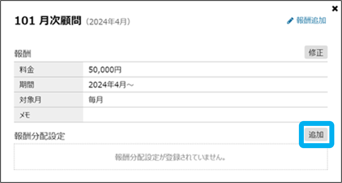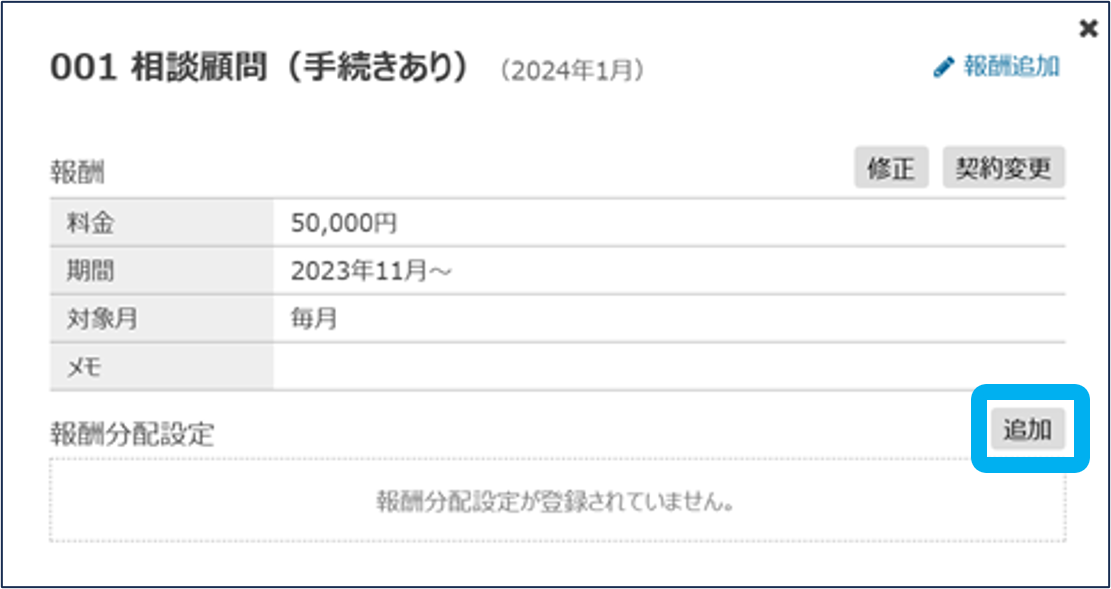 報酬管理の関連マニュアル 利用準備編 活用編 HOME マニュアル 所内メニュー 報酬管理 活用編 報酬分配設定 目次 活用編 TOP 報酬管理マニュアル 活用編 画面紹介 TOP 帳票 事務所情報 事務所の編集・切替・新規登録 報酬 報酬(修正・契約変更) 報酬(一括更新) 報酬分配設定 報酬分配設定(一括登録) その他 エクスポート(報酬管理) 一般職員向け画面 報酬分配設定 報酬分配設定を、途中変更・修正・追加できます。 ①「報酬管理」をクリック ②顧客内の「顧客一覧(顧客管理)」をクリック ③「報酬」をクリック 追加はこちら 追加はこちら 途中変更・修正 ④アイコンをクリック ⑤分配設定を途中で変更する場合は「20XX年○月以降を変更」をクリック 分配設定を修正する場合は「修正」をクリック ⑥必要な項目を設定し、「登録」をクリック 報酬分配設定の途中変更・修正が完了しました。 追加 ④アイコンをクリック ⑤「追加」をクリック ⑥必要な項目を設定し、「登録」をクリック 報酬分配設定の追加が完了しました。 このページを印刷する 報酬管理のよくあるご質問 各帳票を表示する上で、制限はありますか? 「担当者-業績」用分類の、ベース売上とスポット売上の違いは何ですか? 「担当者-業績」/項目設定では、どのように登録したらよいですか? 確定年月は、何を制御するものでしょうか? 報酬管理の閲覧権限、報酬の閲覧・登録権限はどこで設定できますか? 報酬はどのように登録しますか? 契約変更で報酬の料金が変わる場合、どのように変更すればいいですか? 報酬や報酬分配設定の一括登録はできますか? 年の途中から担当者が変わる場合、どのように修正しますか? 顧問契約解除により報酬がなくなる場合はどうしたらよいですか?