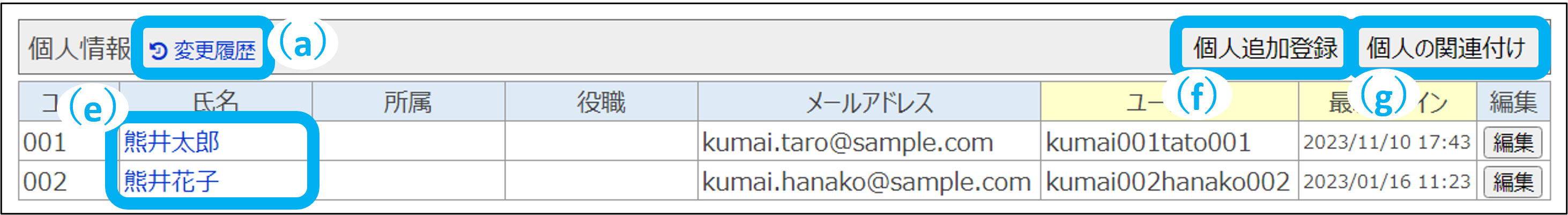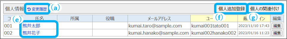 氏名をクリックすると個人情報を確認できます。