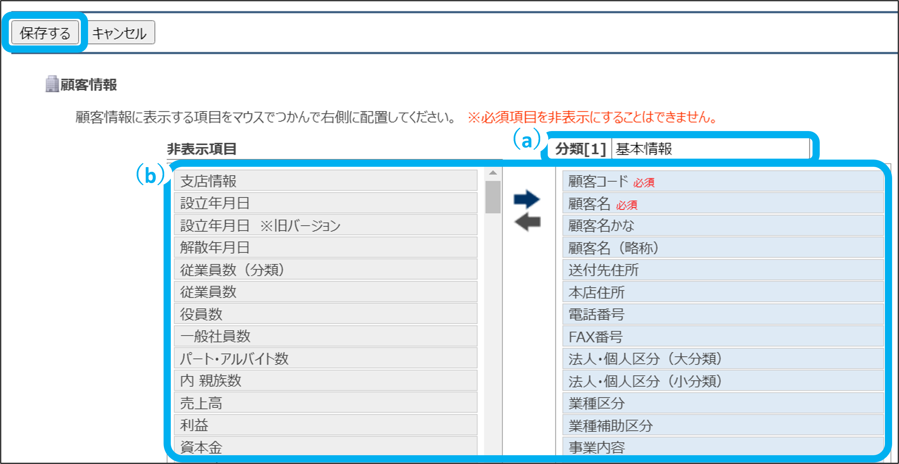 ③顧客情報・個人情報に表示する項目を設定し、「保存する」をクリック