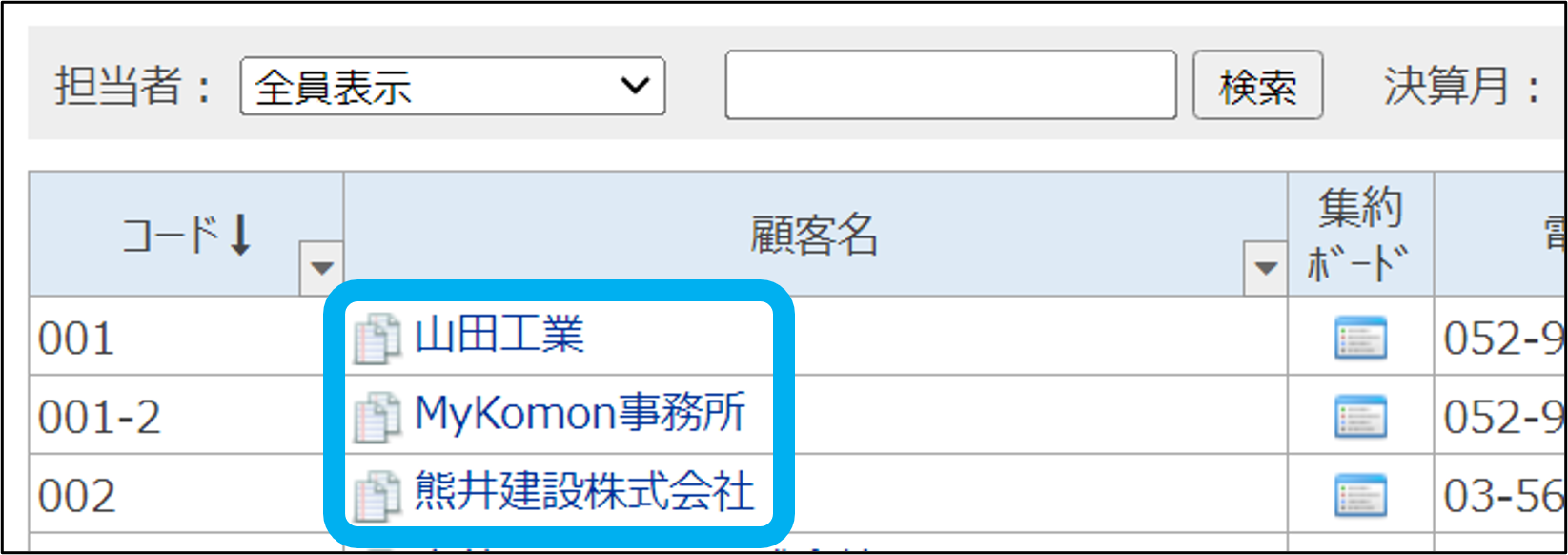 担当者設定をした場合、各メニューの顧客選択画面に担当の顧客名が表示されるようになります。