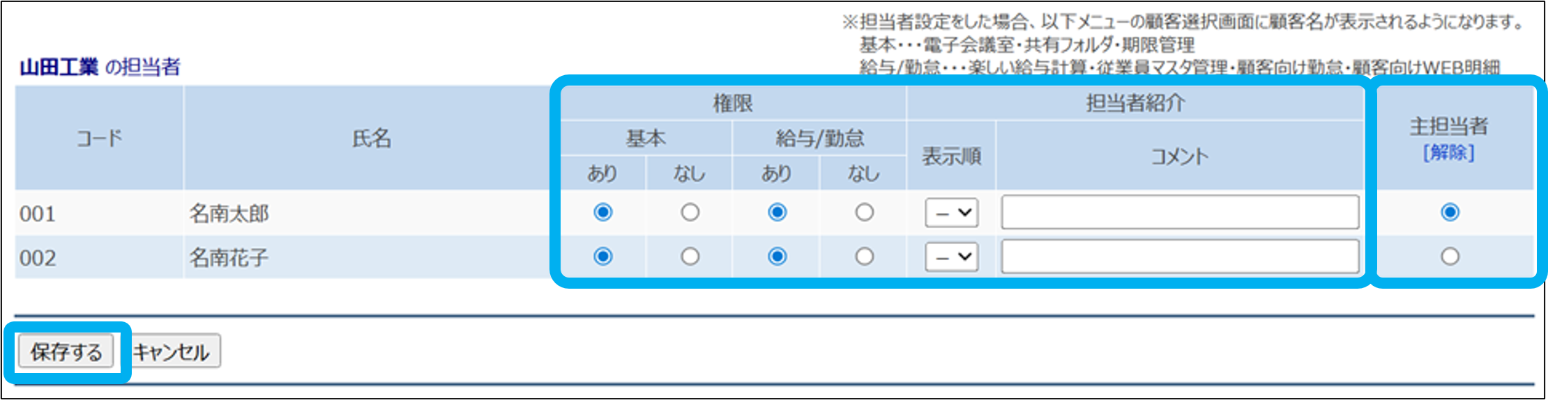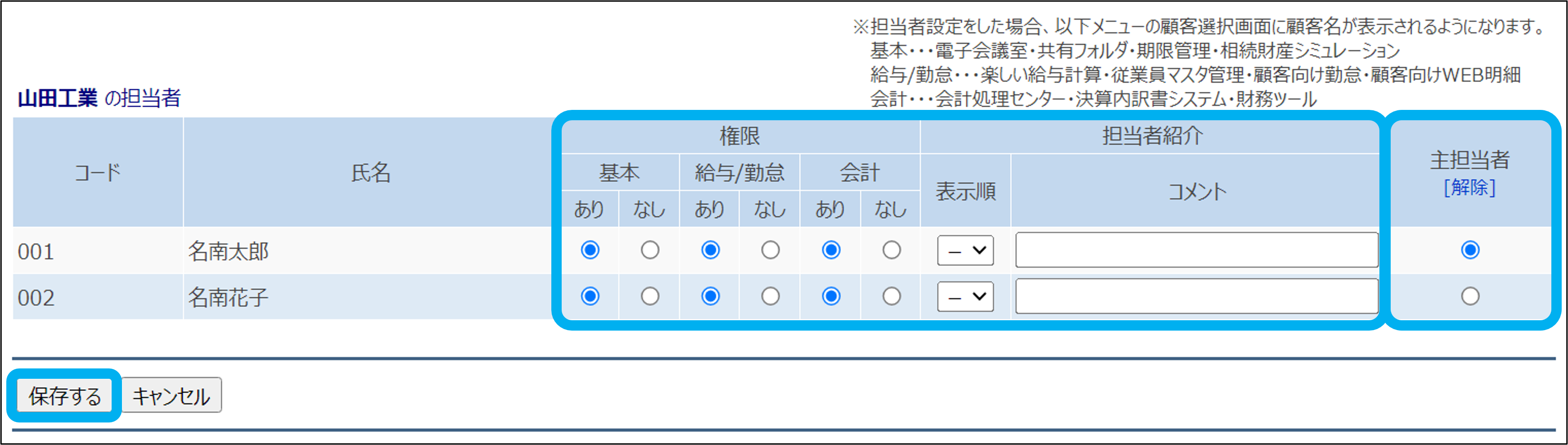 ②職員ごとに、閲覧・操作できるメニューを選択し、必要に応じて「主担当者」欄をクリック