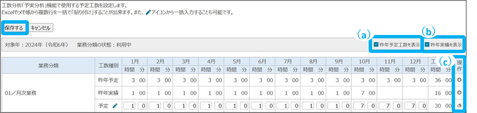 ⑤業務分類ごとの予定工数を入力し、「保存する」をクリック