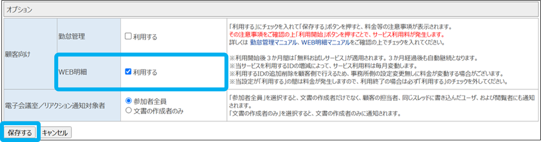 ④WEB明細の「利用する」にチェックし、「保存する」をクリック