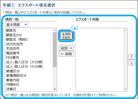 ※「法人・個人区分(大分類)」「法人・個人区分(小分類)」は、2項目セットでないとエクスポートできません。