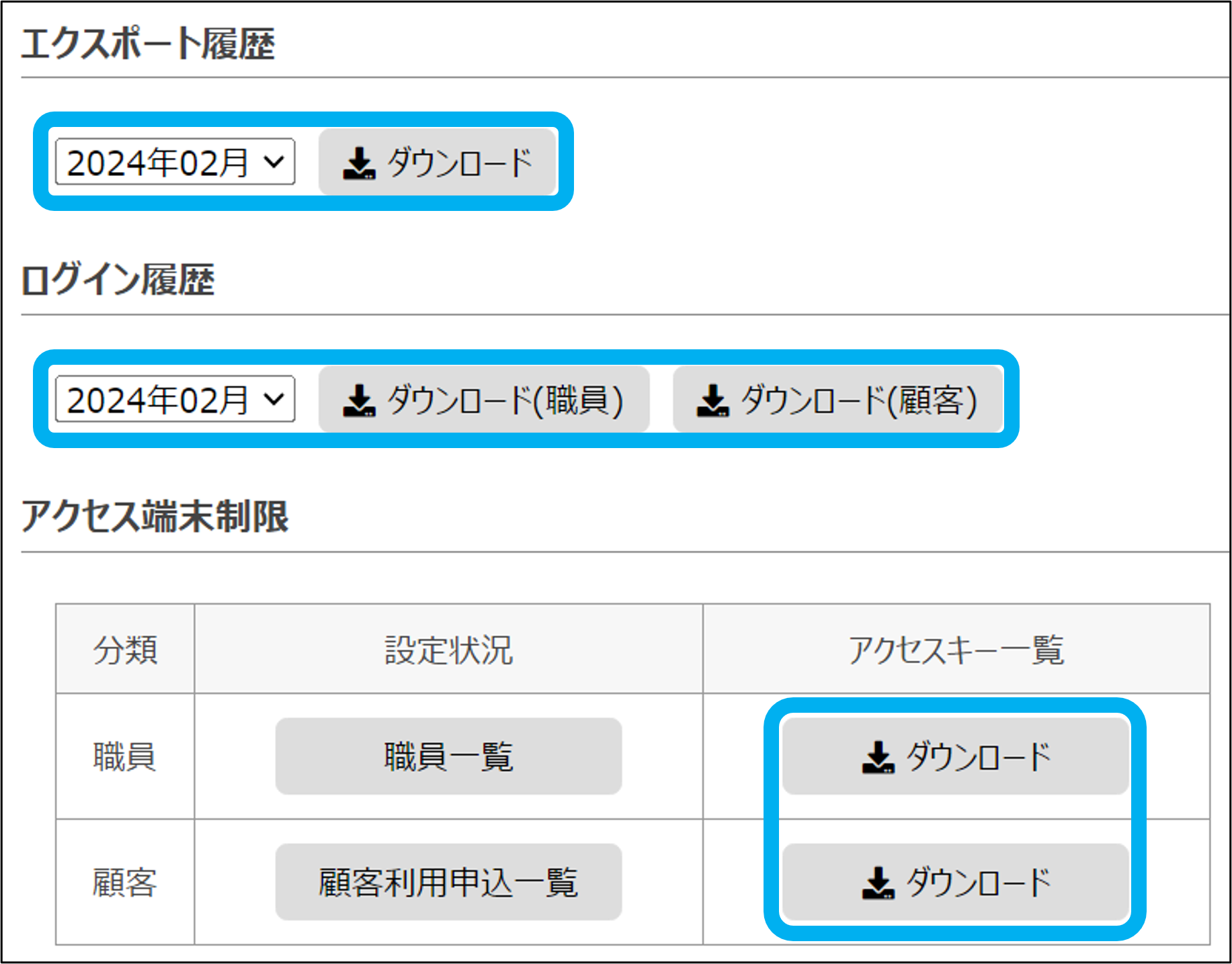 事務所向けの関連マニュアル 事務所管理編 顧客管理編 運用管理・各種設定編 職員向け HOME マニュアル ユーザー別 事務所向け 運用管理・各種設定編 セキュリティ管理/ダウンロード 目次 運用管理・各種設定編 TOP IT担当者向けマニュアル 運用管理・各種設定編 運用管理 利用状況 容量管理 運用データエクスポート アクセス分析 エラーメール管理 セキュリティ管理/ダウンロード アクセス端末制限/概要 アクセス端末制限/設定(職員) アクセス端末制限/発行状況・追加・解約 アクセス端末制限/設定・解約(顧客) 各種設定 電子会議室設定(テンプレート管理) 電子会議室設定(リアクション利用設定) マイナンバー連絡設定 共有フォルダ設定(全顧客共通フォルダ管理) 共有フォルダ設定(顧客ID/権限設定) 共有フォルダ設定(電子帳簿保存フォルダ/フォルダ管理) 共有フォルダ設定(電子帳簿保存フォルダ/ファイルサイズ上限設定) 楽しい給与計算設定 科目パターン設定 トレーニング設定 グループウェア設定 養成動画設定 顧問先公開ニュース 相続財産シミュレーション/入力アシスト候補設定 事務所向け勤怠管理申込 請求管理申込 デザイン設定 その他 事務所からのお知らせ セキュリティ管理/ダウンロード データのエクスポート履歴およびログイン履歴、アクセス端末制限のアクセスキー一覧をダウンロードできます。 ※ダウンロードできる期間は、当月を含む過去4か月分です。 ① 「セキュリティ管理」をクリック ②確認したい情報の「ダウンロード」をクリック ダウンロードが完了しました。 このページを印刷する