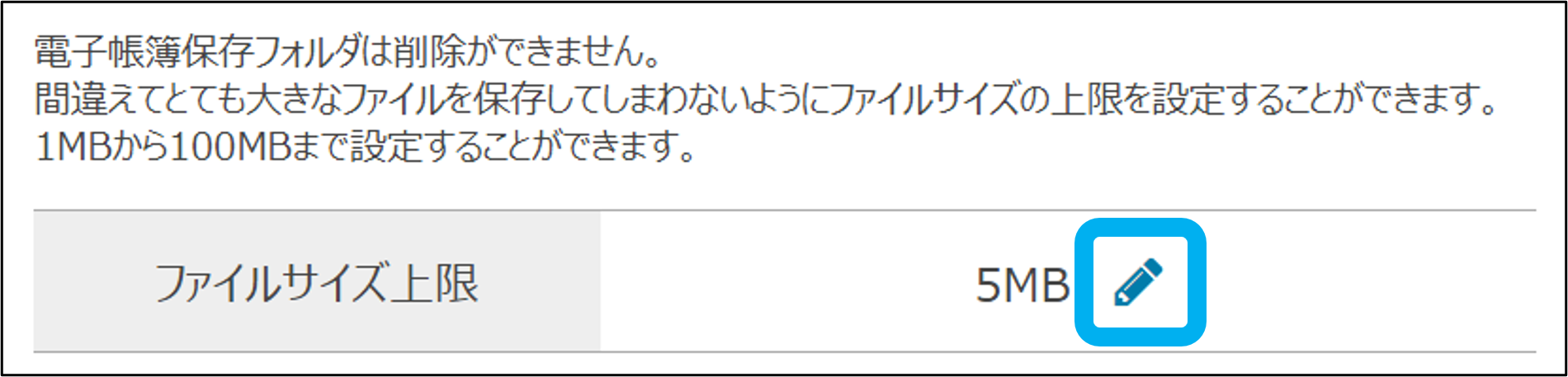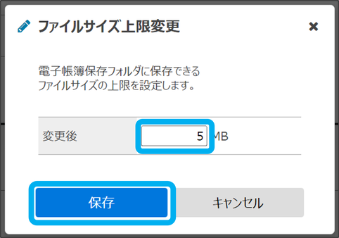 電子帳簿保存フォルダ(緑色)に保存できる、ファイルサイズの上限を設定します。