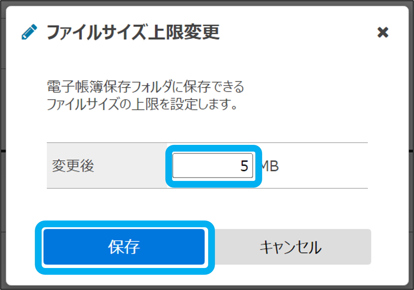 ④ファイルサイズの上限を入力し、「保存」をクリック