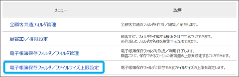 ②「電子帳簿保存フォルダ/ファイルサイズ上限設定」をクリック