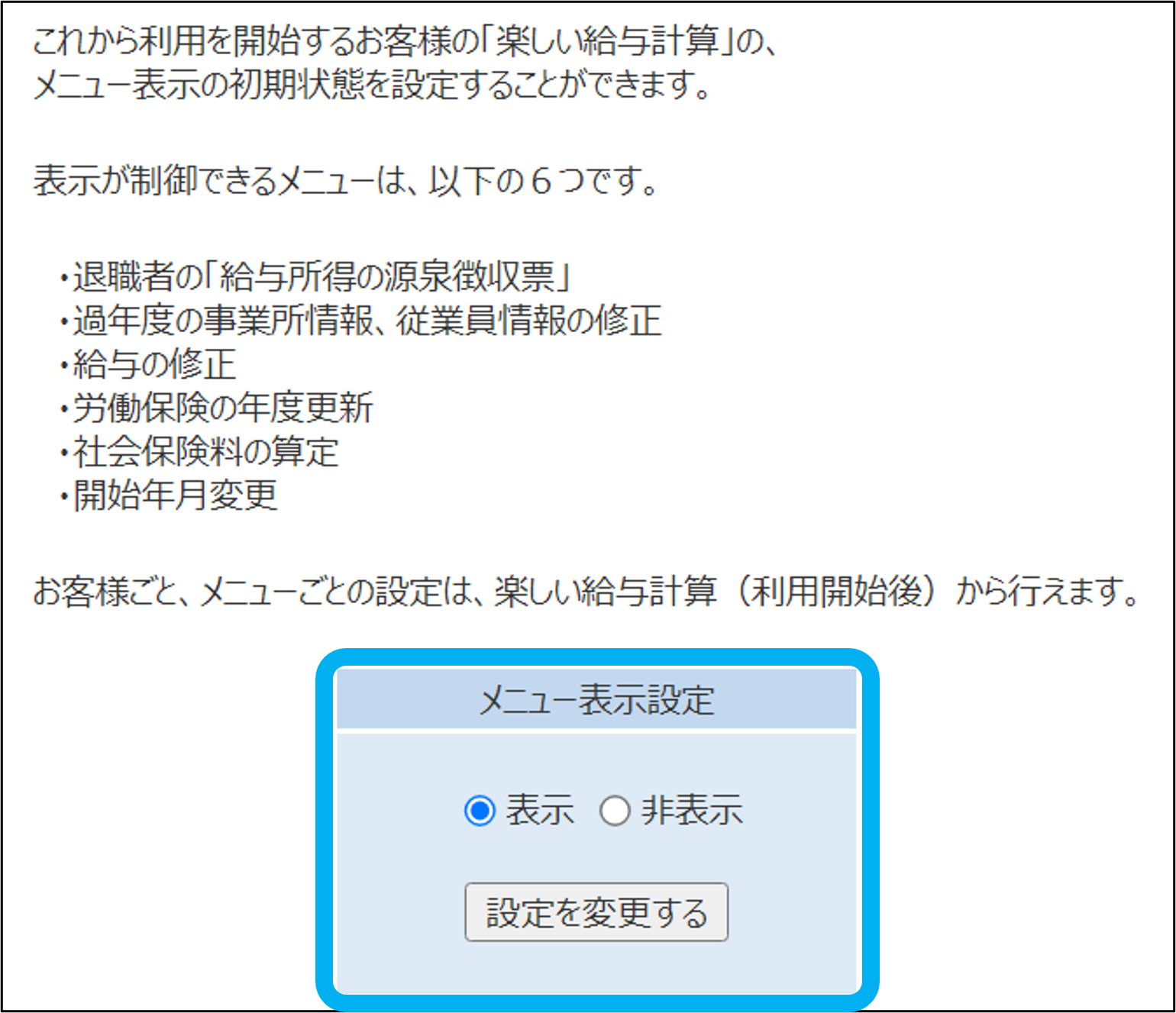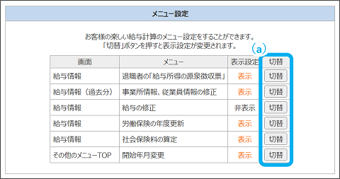 ※既に「楽しい給与計算」を利用している顧客のメニュー表示設定は、ここでは変更できません。