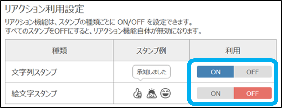 電子会議室で利用する、リアクション機能のON/OFFを切り替えることができます。