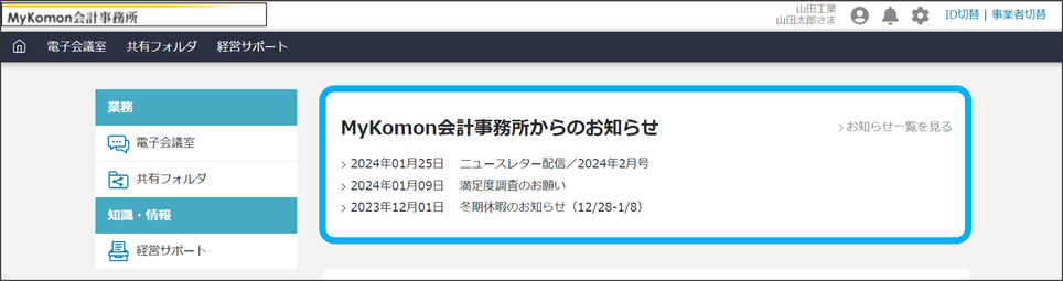 顧問先がMyKomonにログインをすると、ホーム画面で以下のように表示されます。