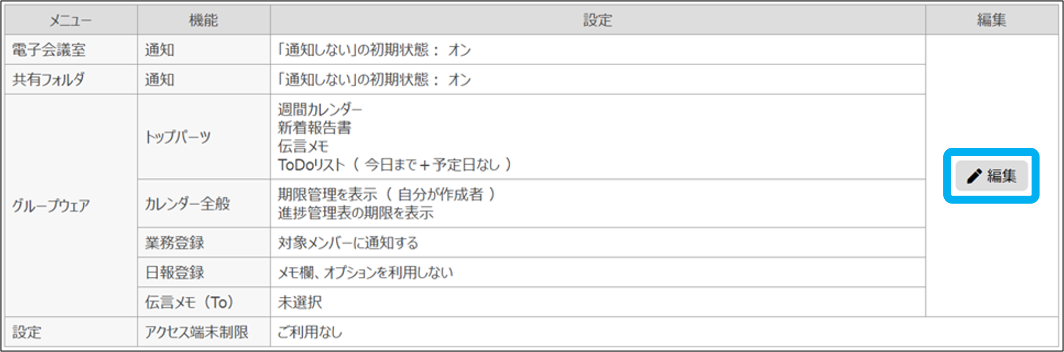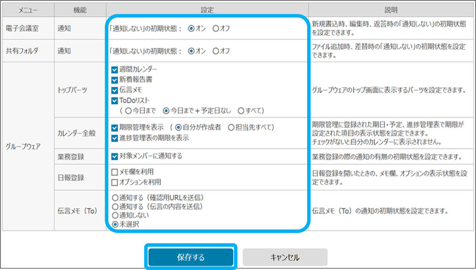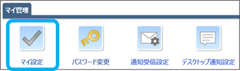 事務所向けの関連マニュアル 事務所管理編 顧客管理編 運用管理・各種設定編 職員向け HOME マニュアル ユーザー別 事務所向け 職員向け マイ設定 目次 職員向け TOP 職員向けマニュアル マイ管理 マイ設定 通知受信設定 マイ設定 グループウェアのトップパーツ等の設定を確認、変更できます。 ①「マイ設定」をクリック ※一般職員は「設定TOP」をご確認ください。 ②「編集」をクリック ③必要な項目を設定し、「保存する」をクリック マイ設定が完了しました。 このページを印刷する