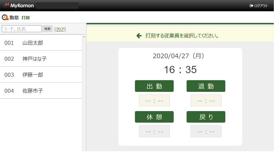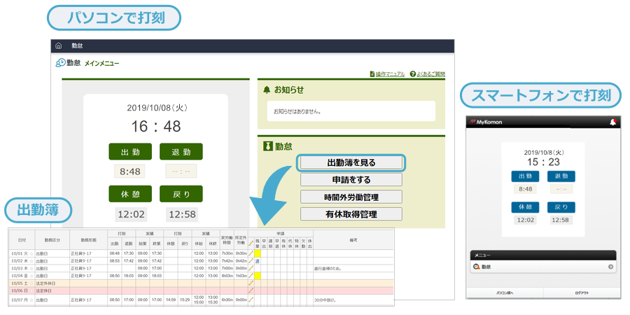 事務所から顧客に提供できる勤怠管理システムです。顧客もしくは事務所が初期設定を行い、すぐに利用開始できます。従業員は、パソコン・スマートフォンからMyKomon へログインして、打刻するだけ。出勤簿の作成、有休管理、各種申請も行うことができます。