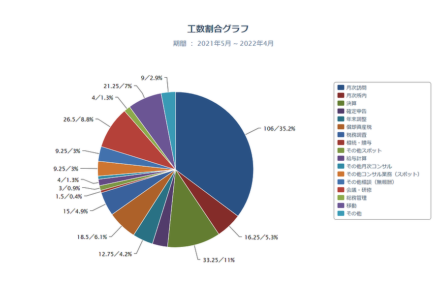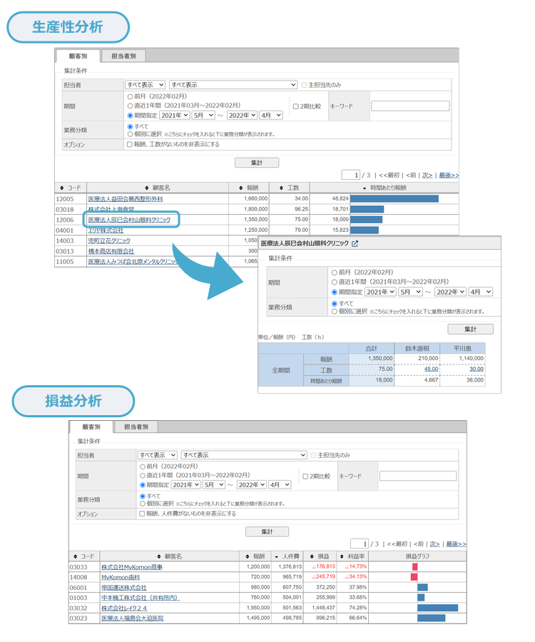 予定や実績がそのまま工数として顧客ごと・業務分類ごとに自動的に集計されます。「事務所全体」→「顧客別」→「月別推移」のように掘り下げて分析ができます。