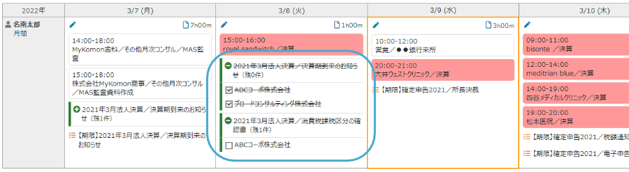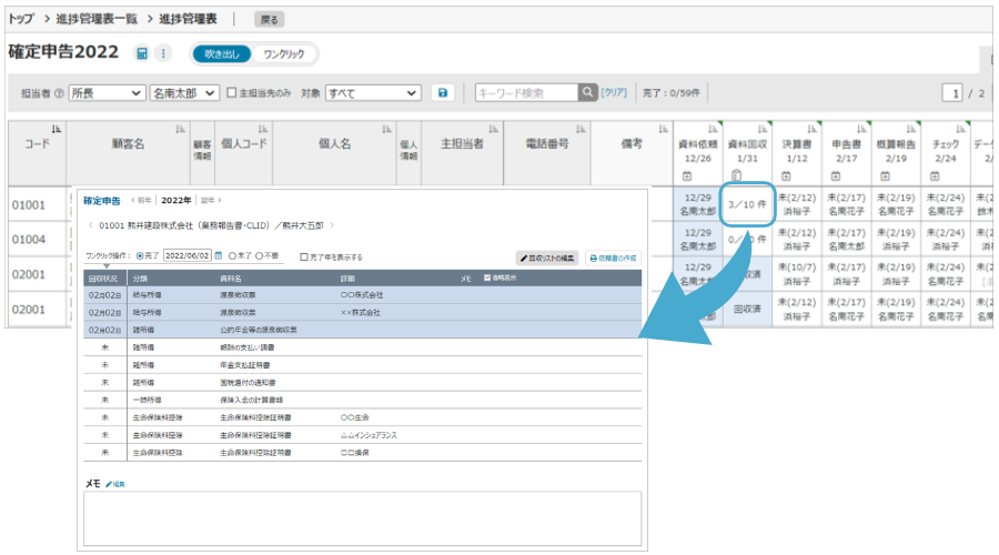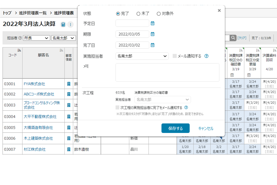 確定申告や年末調整などの期限が決まっている業務だけでなく、月次処理などの毎月定期的に発生する業務の進捗も管理することができます。