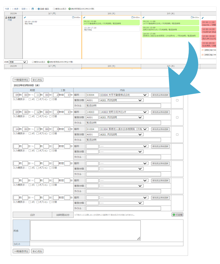 登録した予定をもとに個別の業務を詳細に報告する業務報告書と、1日の業務を報告する日報を簡単に作成できます。