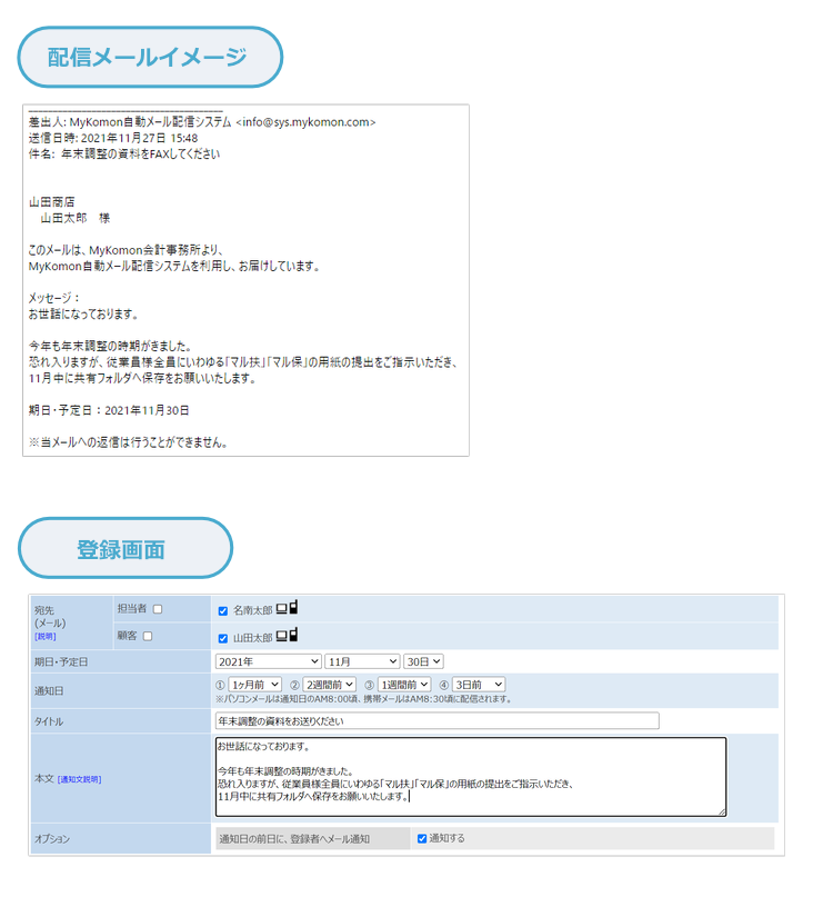 期限管理の紹介 顧客ごとに期限と予定を登録しておけば、指定した日にメールで知らせてくれる機能です。 HOME メニュー紹介 業務メニュー 期限管理 ポイント 主な機能の紹介 成功事例の紹介 よくあるご質問 マニュアル 期限管理のポイント 連絡漏れの心配いらず 主な機能の紹介 連絡漏れの心配いらず あらかじめ文書と通知日を登録しておくと、自動的に携帯メール・PCメールにメッセージを配信することができます。 源泉所得税の納付忘れを防ぐアナウンスなど、一度登録してしまえば連絡漏れがなくなり、業務の段取りも飛躍的に向上します。 成功事例の紹介 CASE. いつも最適な時期にお知らせがあるねと喜ばれています 担当者によって連絡時期がばらつきがある うちの事務所は、顧客への連絡事項は担当者に任せているんですが、毎月の会議で確認しても、担当者によって連絡する時期にバラつきがあるんです。先日、ある社長から「納特の連絡がギリギリで焦ったよ。こっちも確認不足だったけど、もう少し余裕をもって連絡が欲しかったな」と言われてしまいました。こういった連絡を、なんとかシステム化したいのですが・・・。 事前登録で、スムーズに余裕をもって連絡できるようになった あらかじめ納期の特例を通知したい日を設定しておくと、自動的に顧客へお知らせのメールが届きます。また、通知前日に担当者には顧客へ通知されることをお知らせしてくれる機能も付いています。繰り返し登録をしておけば何年も先まで通知が行くようにできるので、1回登録すればとても便利です。顧客からも「いつも前もって連絡が来るので本当に助かります」ととても喜んでいただいています。今では、納期の特例や年末調整、確定申告といったスポットのお知らせに加えて、毎月回収したい資料の依頼も期限管理を利用しています。 期限管理のよくあるご質問 Q. 登録済みの期限管理を、一括で削除する方法はありますか? Q. 電子会議室に新規書き込みする際の、「書込み後、期限管理登録へ」とはなんですか ? もっとみる 期限管理のマニュアル ダウンロードする 期限管理を使用されている方へおすすめのメニュー 顧客管理 楽しい給与計算 進捗管理表 電子会議室 お問い合わせはこちら 移転、事務所名変更などの情報変更もこちらからご依頼ください。 お問い合わせはこちら 情報変更依頼はこちら