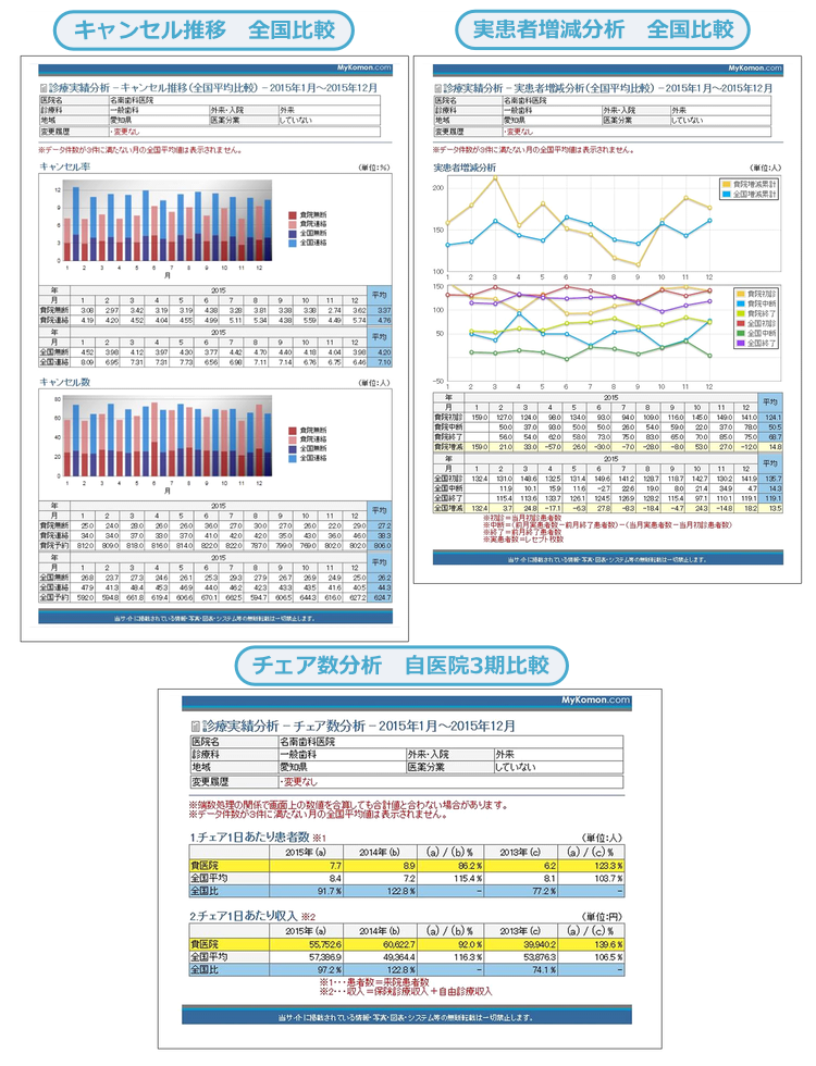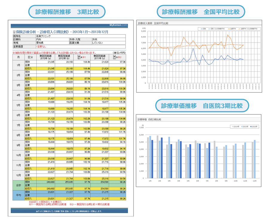 一般企業にとって売り上げ分析が重要なように、医院経営にも収入分析が必要です。医院にとっての収入である診療報酬を分析し、前年比較や全国平均、都道府県平均など、蓄積されたさまざまなデータと比較することができます。全国および同一都道府県内平均値データは他事務所との差別化にもつながるため、営業ツールとしても利用できます。