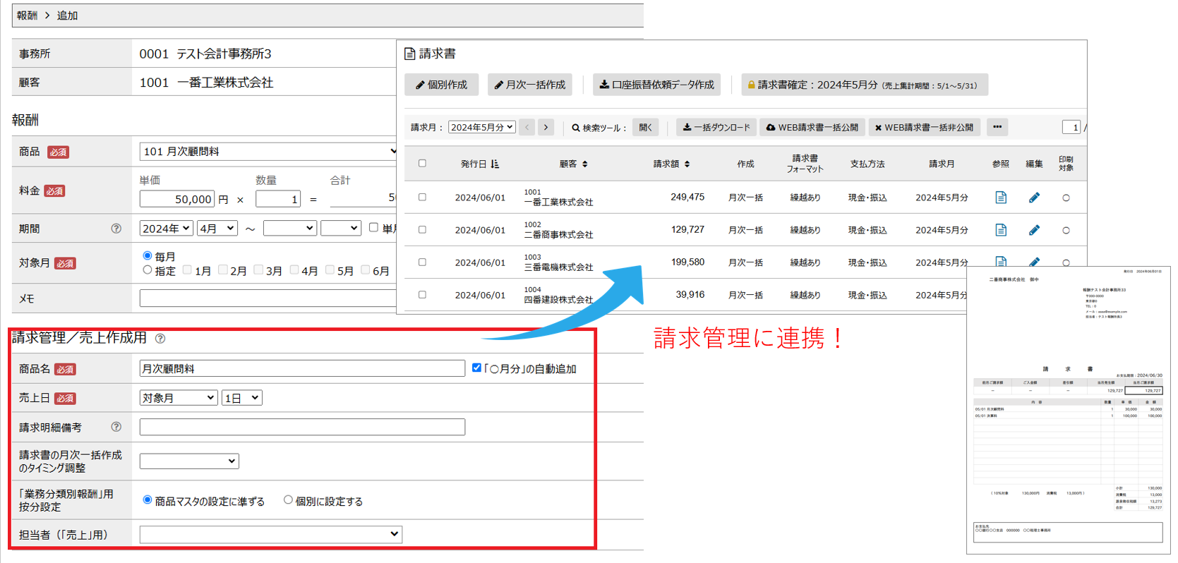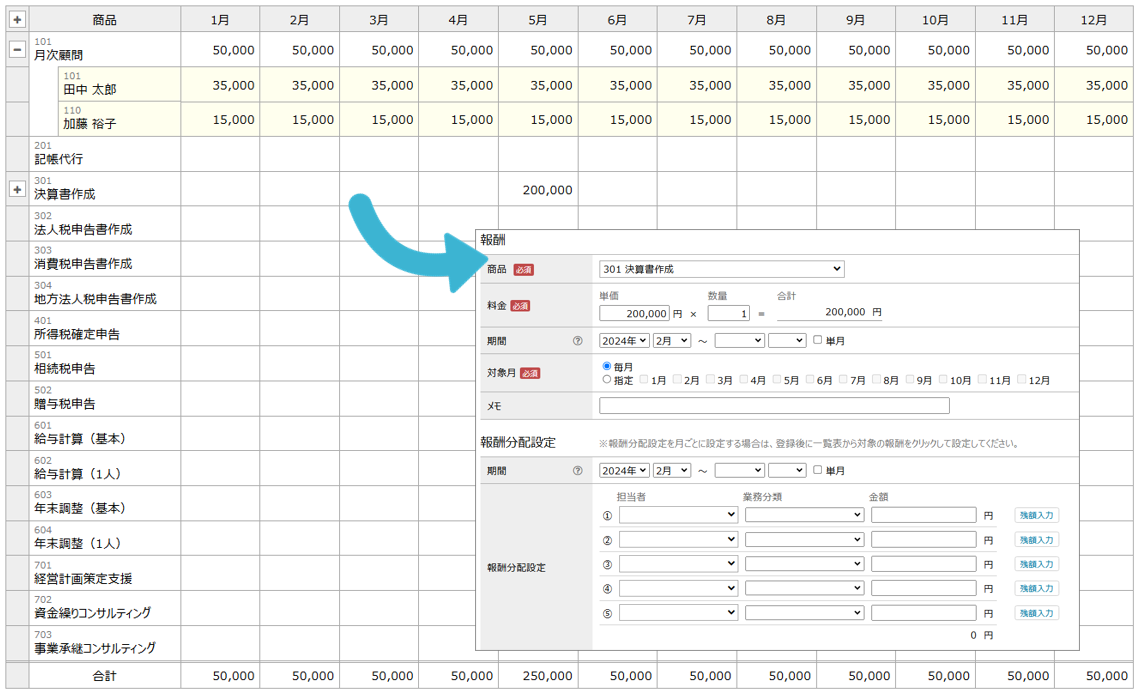 報酬管理の紹介 顧客管理で顧客からの報酬を一元管理できます。 報酬データは請求管理に連動し、報酬を集計した帳票も活用できます。 HOME メニュー紹介 所内メニュー 報酬管理 ポイント 主な機能の紹介 成功事例の紹介 よくあるご質問 マニュアル 報酬管理のポイント 顧客からの報酬を分析し事務所経営に活かせる 担当者別に正確な工数分析ができる 報酬情報から請求書を作成できる 主な機能の紹介 顧客からの報酬を分析し事務所経営に活かせる 顧客管理で報酬を一元管理できます。 商品別・担当者別・顧客別など様々な角度で分析し、事務所経営に生かすことができます。 推移・割合・年計など多様なグラフもご用意。視覚的に把握することが可能です。 担当者別に正確な工数分析ができる 担当者ごとの報酬を登録できます。 1件の顧客に複数担当者が関わる場合も担当者ごとの報酬を自由に按分でき、成果を見える化できます。 報酬情報から請求書を作成できる 報酬情報を請求管理へ連動させることが可能です。 顧客管理へ登録した報酬情報は請求管理に連携でき、請求管理より対象の請求書をスムーズに発行できます。 画面下部「おすすめのメニュー」より、請求管理もあわせてご覧ください。 成功事例の紹介 CASE. 手間なく事務所の売上管理が可能に! Excelでの売上管理に手間がかかっていた これまでExcelで事務所の売上管理をしていましたが、Excel作成や情報整備に時間がかかっていました。 売上情報を毎月MyKomonの請求管理から転記していたので、転記漏れがないかのチェックも手間で、 本来のお客様対応などの業務に時間をあてるために、何とか手間が削減できないかと考えていました。 売上分析に時間をかけられるように 月次顧問料や決算料などのベースの報酬情報は、一度登録してしまえば毎月・毎年同じ金額が入ってくるので集計が楽になりました。 契約変更があった時も変更となる月の情報を更新してしまえば、それ以降の情報も反映されます。 また、MyKomon請求管理と連動しているので、実際の請求金額との相違もなくなりました。 今は気になった時に事務所の現状や今期の着地予測がすぐに把握できるので、助かっています。 CASE. 職員別の売上分析・工数分析が可能に! 職員別の分析はExcelで作成していた MyKomonの工数分析では顧問先の生産性分析を行い、各顧問先の時間単価について確認しています。 一方で、職員別の分析では売上の分配を自由に設定できなかったため、Excelを別に作成して分析していました。 毎月MyKomonからデータをダウンロードしてExcelに転記していて、結構な時間がかかるので負担になっていました。 分析データもMyKomonとExcelに分かれるので、なんとか一元管理できないかと思っていました。 MyKomonで一元管理! 報酬管理では、月次顧問料や決算料などの売上ごとに『誰にいくら割り振るか』を設定できるようになりました。 実態に合った形で売上の割り振りが出来るので、職員別の売上の集計・分析はもちろん、職員別の生産性分析もすべてMyKomonで行っています。 また、これまで工数分析用に登録していた業務分類別報酬は、年に1回年度更新が必要でしたが、 報酬管理では年度更新が必要なく、常に情報が反映されるので手間がなくなりました。 MyKomonですべての情報が一元管理できて助かっています。 報酬管理のよくあるご質問 Q. 報酬や報酬分配設定の一括登録はできますか? Q. 顧問契約解除により報酬がなくなる場合はどうしたらよいですか? Q. 確定年月は、何を制御するものでしょうか? Q. 各帳票を表示する上で、制限はありますか? Q. 年の途中から担当者が変わる場合、どのように修正しますか? Q. 「担当者-業績」/項目設定では、どのように登録したらよいですか? Q. 契約変更で報酬の料金が変わる場合、どのように変更すればいいですか? Q. 「担当者-業績」用分類の、ベース売上とスポット売上の違いは何ですか? Q. 報酬はどのように登録しますか? Q. 報酬管理の閲覧権限、報酬の閲覧・登録権限はどこで設定できますか? もっとみる 報酬管理のマニュアル ダウンロードする 報酬管理の便利なツール ツールをみる 報酬管理を活用してさらに効率アップ 2025年06月01日 報酬管理を使用されている方へおすすめのメニュー カレンダー 顧客管理 請求管理 工数分析 お問い合わせはこちら 移転、事務所名変更などの情報変更もこちらからご依頼ください。 お問い合わせはこちら 情報変更依頼はこちら