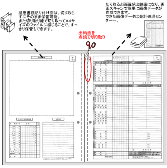 ミシン目入で切り離すと、ジャストA4サイズ。両面に出納欄があってスキャニングも簡単です。