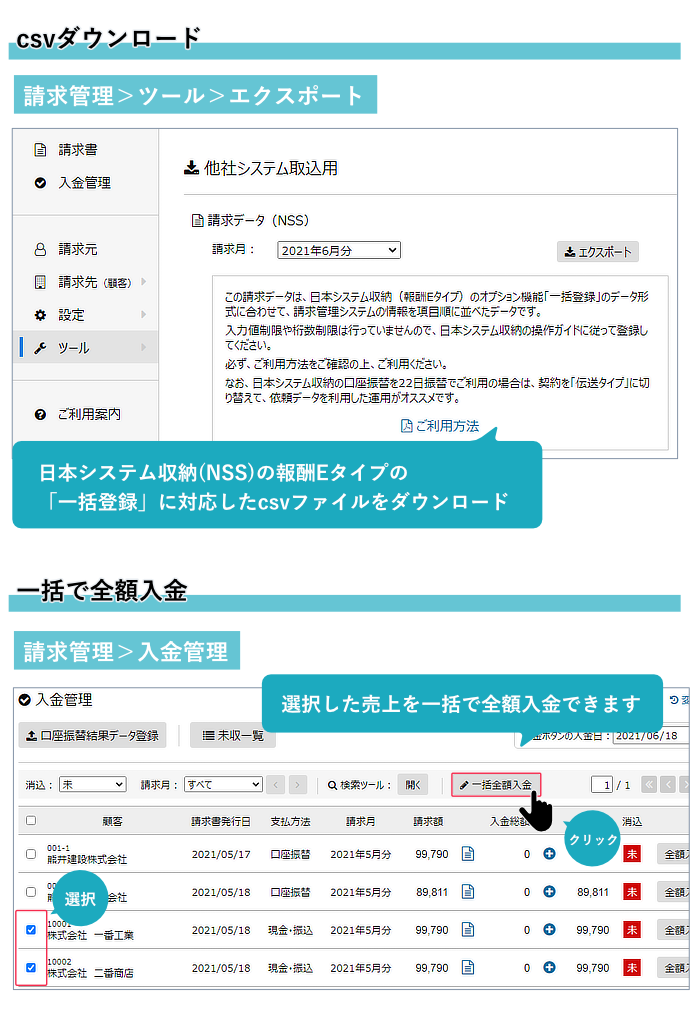 2)入金管理画面で、選択した請求額の「全額入金」を一括でできるようになりました。
