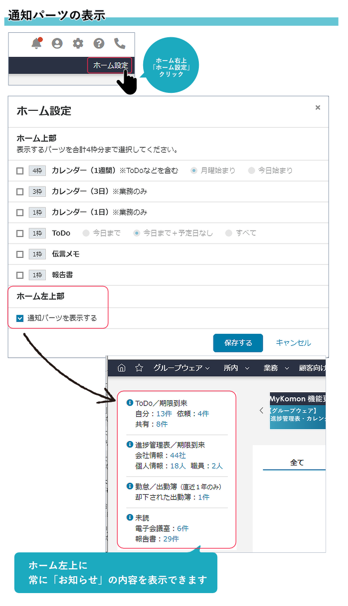 ホーム画面の左上に、電子会議室や報告書の未読、期限が到来したToDo等の通知内容を表示することができるようになりました。