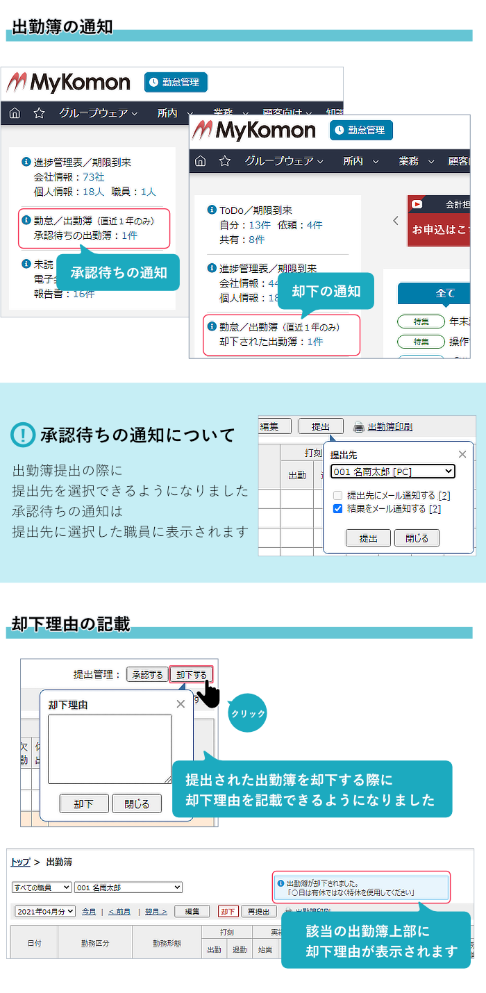 2)出勤簿を却下した際に、却下理由を記載できるようになりました。
