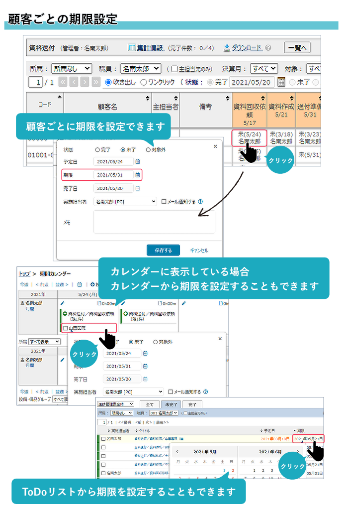 期限は、進捗管理表・カレンダー・ToDoリストから変更することができます。