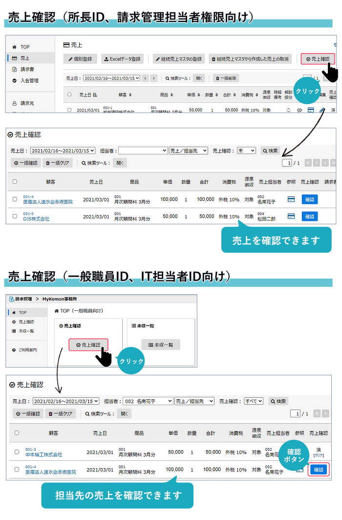 請求管理システムに登録された売上を一般職員も閲覧できるようになりました。確認済みのチェックを打つこともできます。