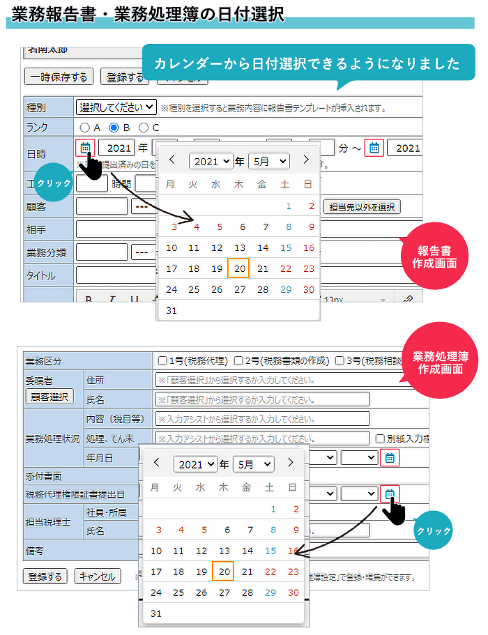 ・業務報告書登録時の日付を、カレンダーから選択できるようになりました。