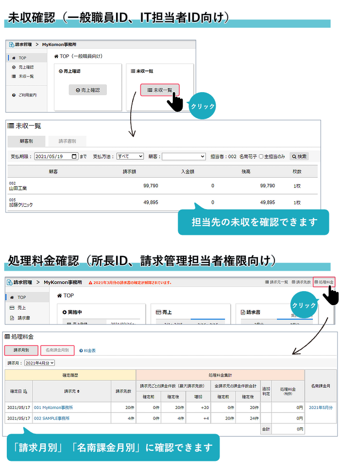 処理料金の内訳を、「請求月別」「名南課金月別」に確認することができます。(所長権限、請求管理担当者権限向け)
