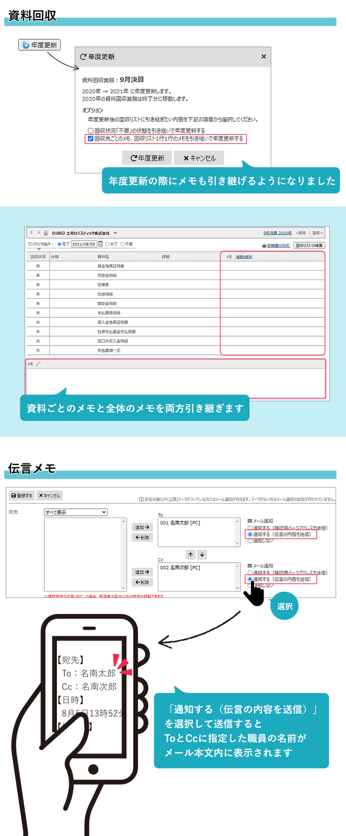 年度更新の際、回収先ごとのメモ及び回収リスト1行ごとのメモを引き継げるようになりました。
