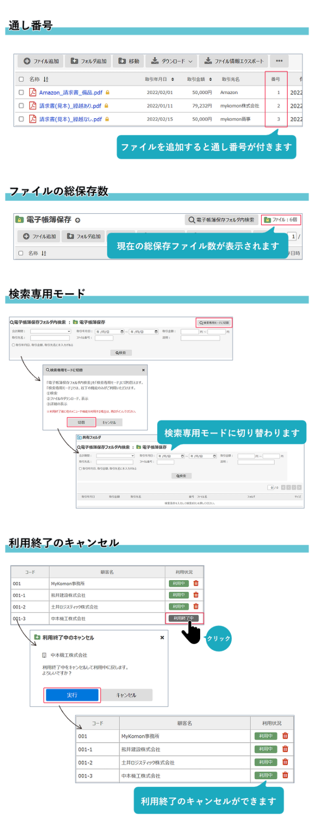 電子帳簿保存フォルダ右上に、現在の総保存ファイル数が表示されます。