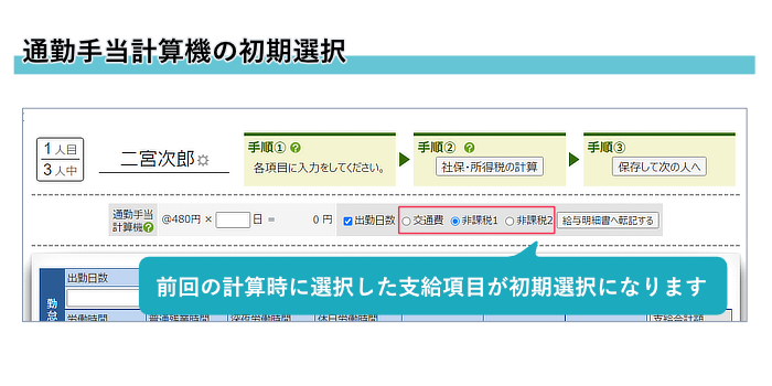2)通勤手当計算機について、前回「転記」を押したときの転記先の手当を覚えて初期選択するようになりました。