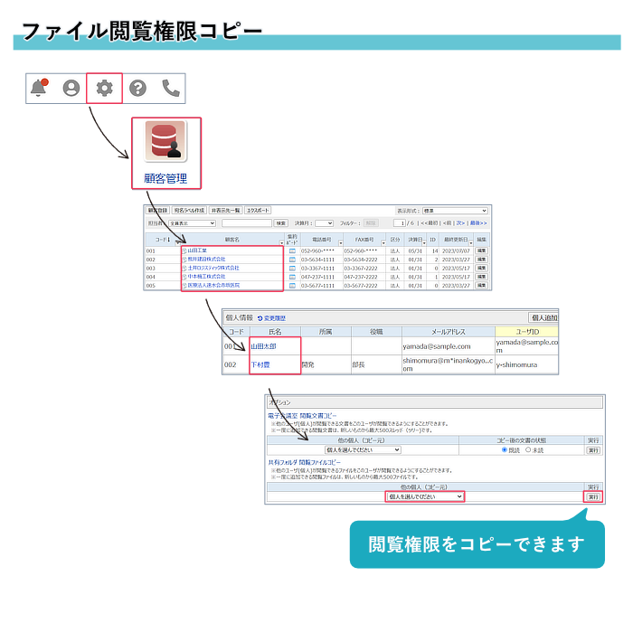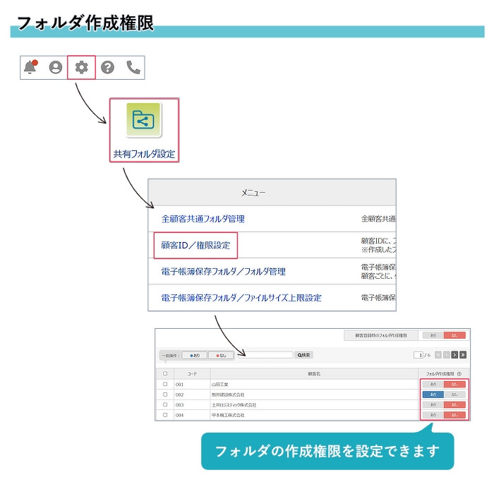 顧客ごとに「フォルダ作成権限」を設定することで、顧客IDでもフォルダを作成できます。