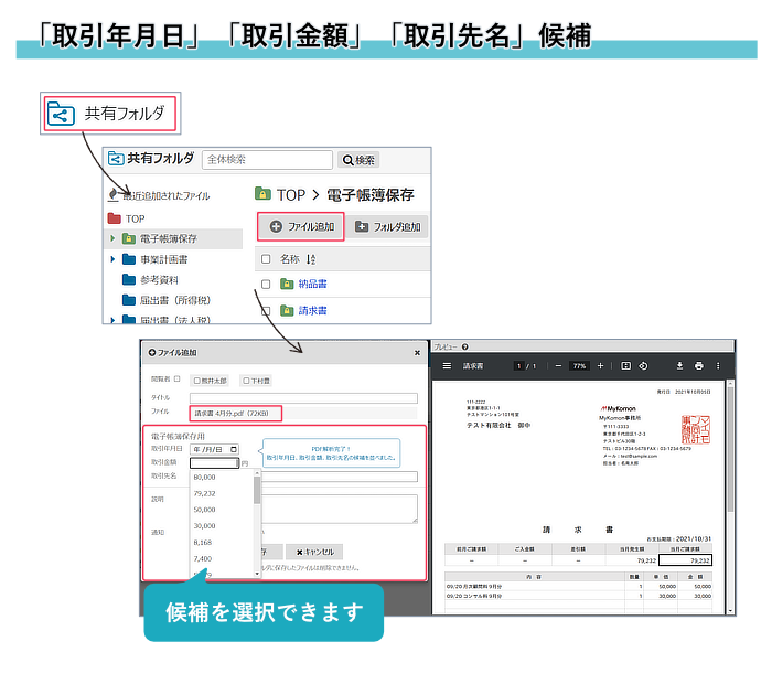 PDFから文字列を抜き出して、「取引年月日」「取引金額」「取引先名」の候補として表示します。