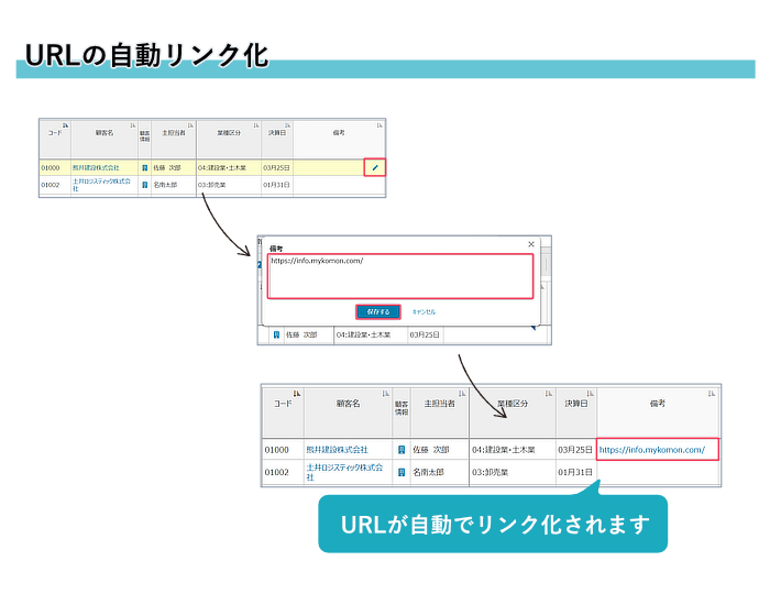 2)「顧客管理項目」や「追加管理項目」に記載されたURLが自動でリンク化されるようになりました。
