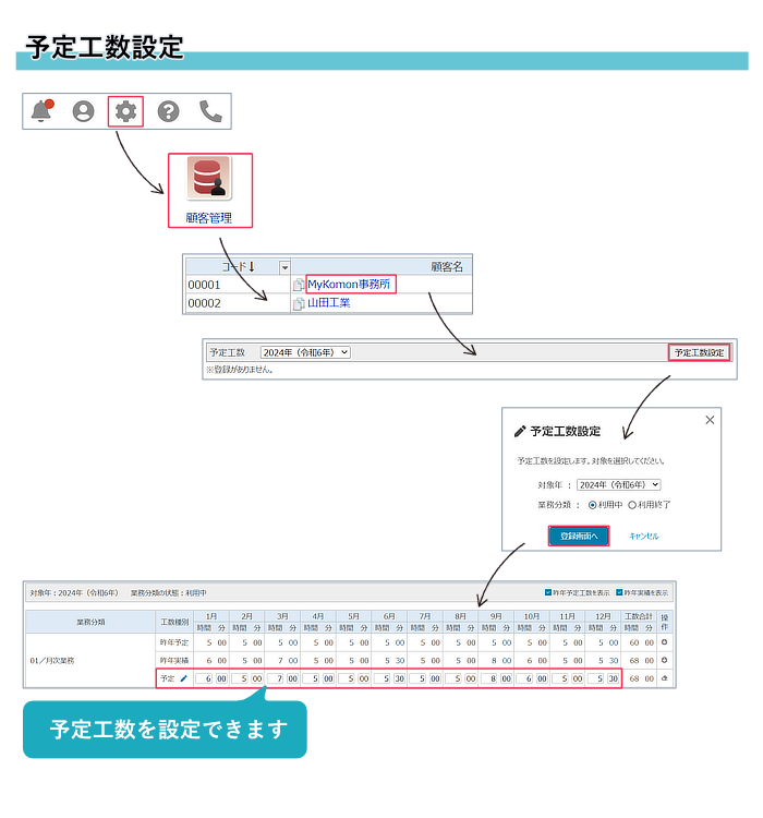 予定工数を登録することで、実績工数との差異を把握し、生産性向上をサポートします。