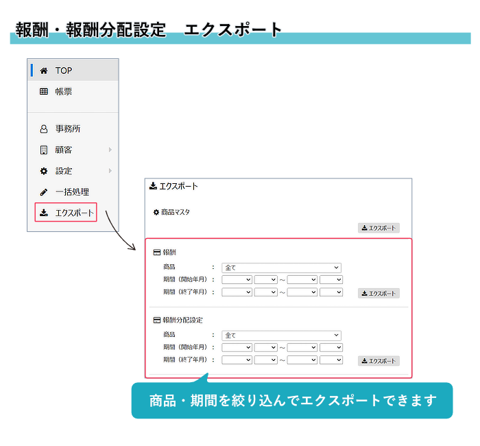 2)報酬、報酬分配設定のエクスポートで、商品・期間の絞り込みができるようになりました。
