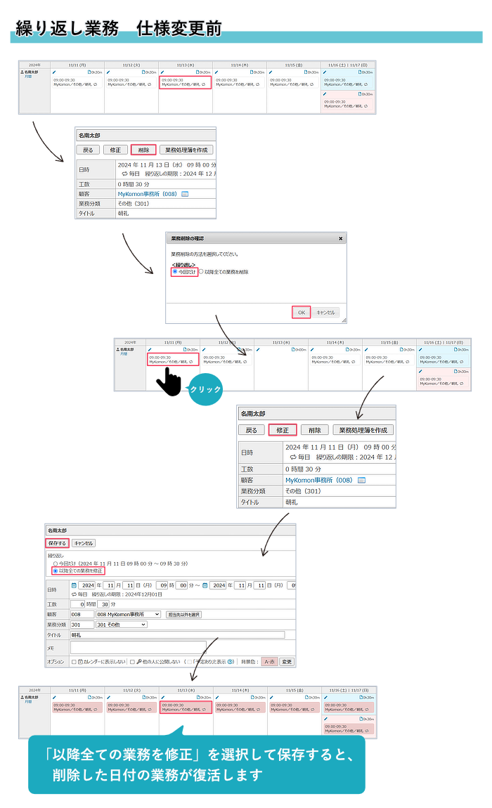 3)繰り返し業務の途中の日付を修正・削除し、その日付よりも前の業務を修正しても、途中の日付の業務は復活しなくなりました。