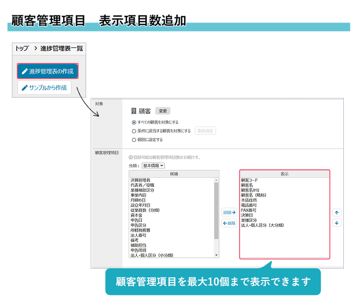 1)顧客管理項目を最大10個まで、進捗管理表に表示できるようになりました。
