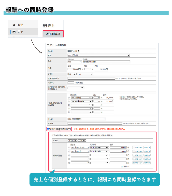 1)売上を個別登録するときに、報酬へ同時登録できるようになりました。