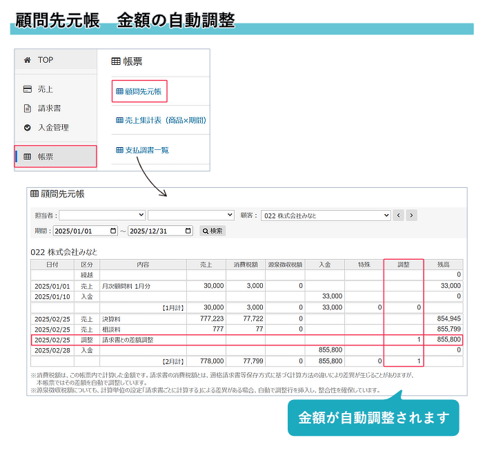 1)顧問先元帳にて、請求書の金額と誤差が生じる場合、自動で金額調整する機能を搭載しました。
