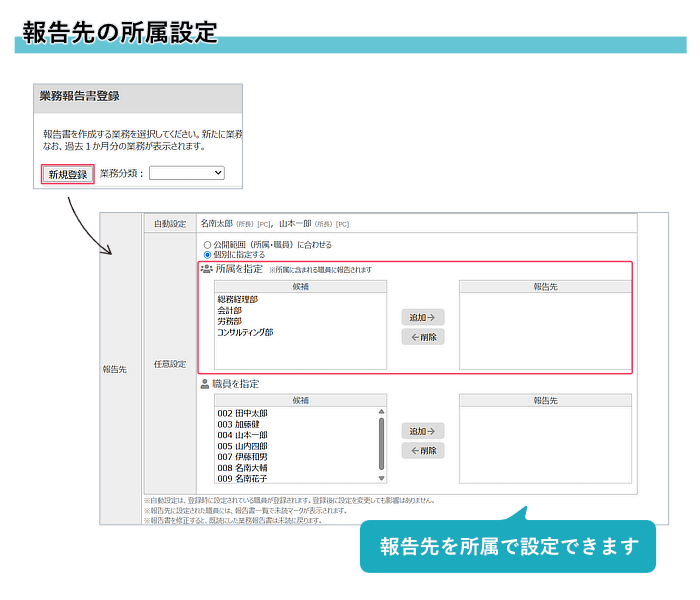 2)報告先を所属で設定できるようになりました。