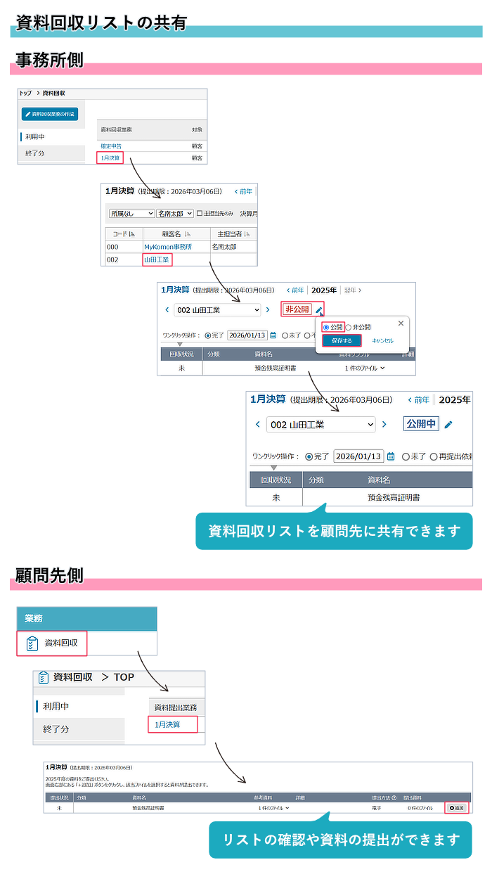2点、設定いただきますと、以下の通り各資料回収リストごとに顧問先への公開ができます。